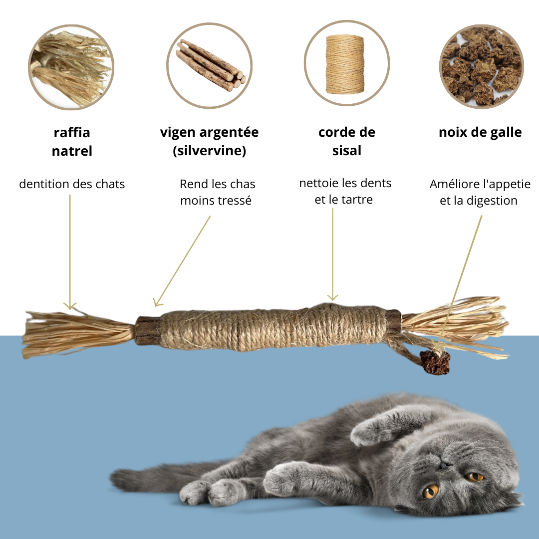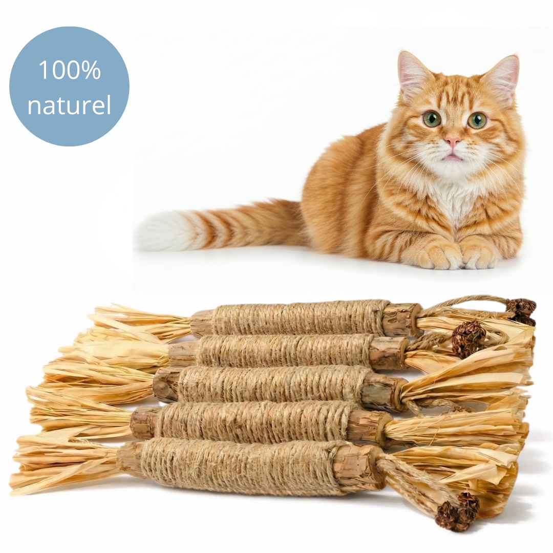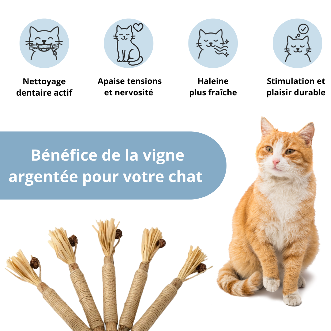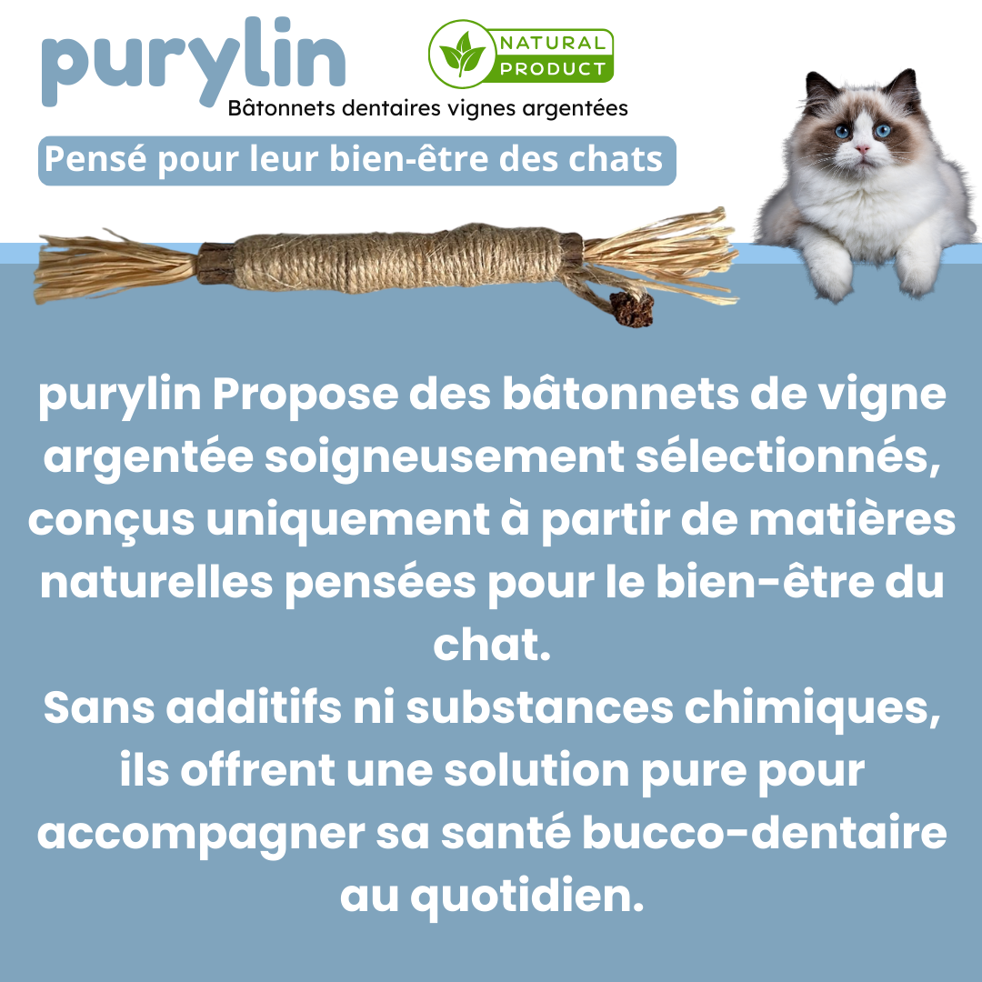 Ces bâtonnets sont fabriqués à partir de vigne argentée 100 % naturelle. Si votre chat avale de petits morceaux en mâchant, ils sont sans danger, digestes et pensés pour être mâchés en toute sécurité — tout en prenant soin de ses dents naturellement.